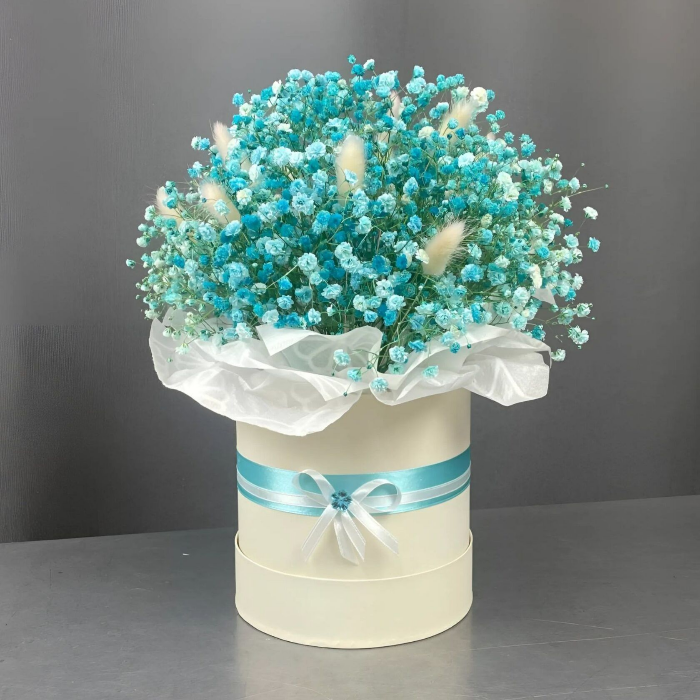 Нежная, воздушная и стильная композиция из лазурного оттенка гипсофилы и лагуруса в изящной шляпной коробке с бантом! Превосходный сюрприз на любой случай! ⠀ Состав: коробка D=25 см, гипсофила, л...