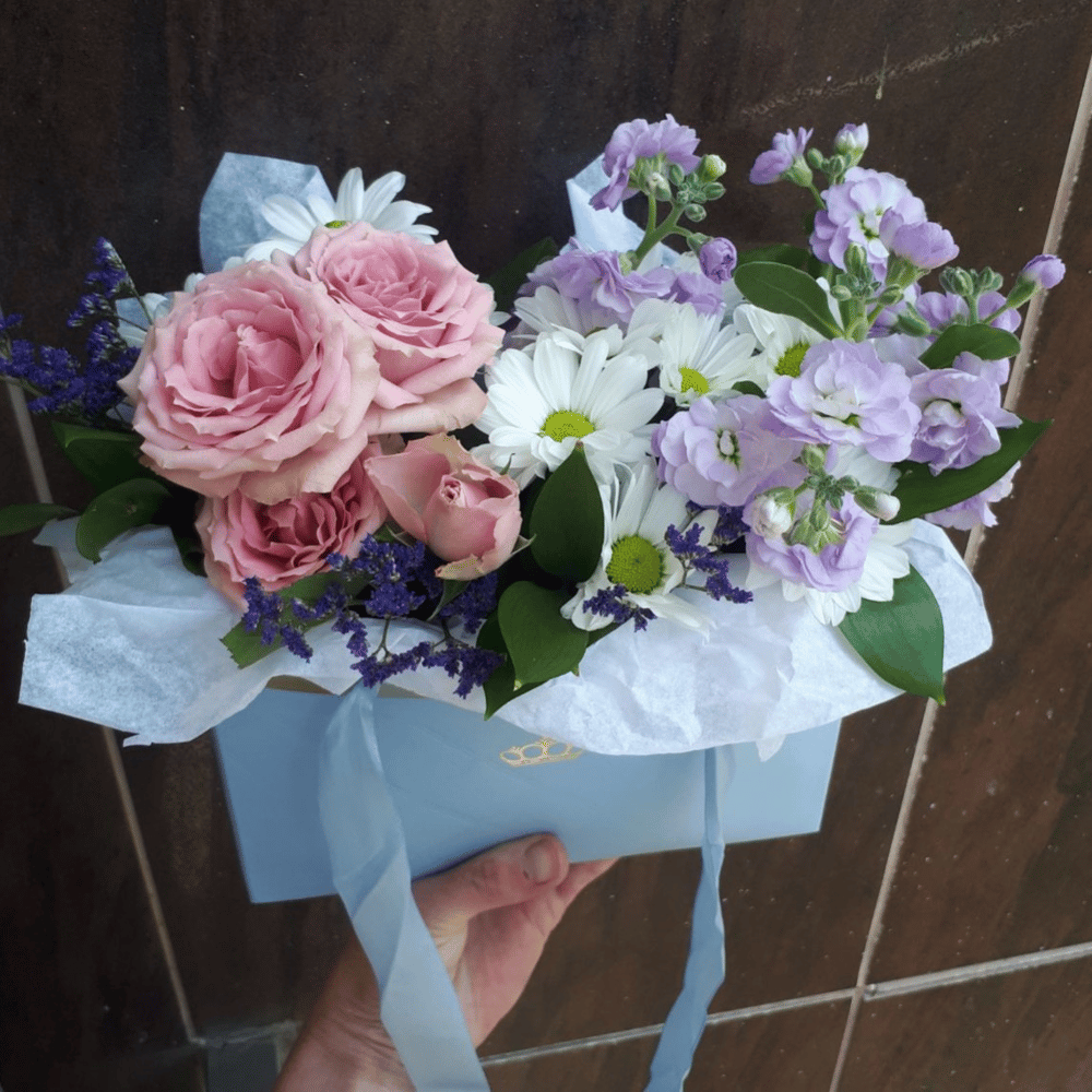 Коробка с цветами «Композиция в сумочке» из роз и хризантем