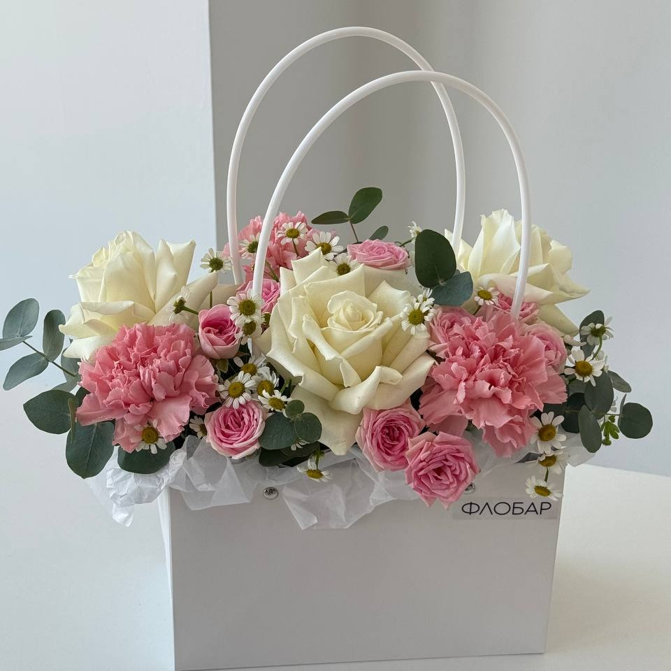 Коробка с цветами «Композиция в сумочке для Нее» из ромашек