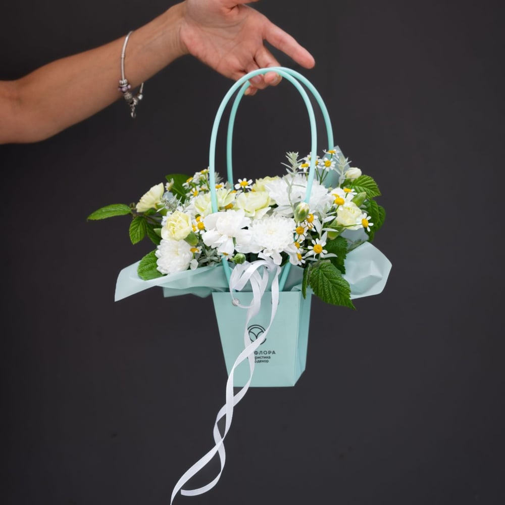 «Утренний бриз» — когда эмоции важнее формата Маленькая, но сильная. Эта композиция доказывает, что настоящие чувства не нужно кричать — их можно прошептать. Лёгкие пастельные тона, воздушная композиция, тонкий аромат природы. Упаковка в цветочную сумочку делает подарок ещё более личным — будто вы передаёте нечто сокровенное, завернутое с любовью. Пусть каждый жест станет значимым. Пусть каждый подарок будет диалогом душ. Приятных, осознанных выборов. ⠀ Размер: высота 35 см., ширина 20 см. ⠀ Состав: цветочная сумочка 6*8*10 см - 1 шт., оазис - 1 шт., упаковка, декоративная зелень - 2 шт., диантус кустовой - 3 шт., хризантема кустовая - 1 шт., матрикария - 1 шт.