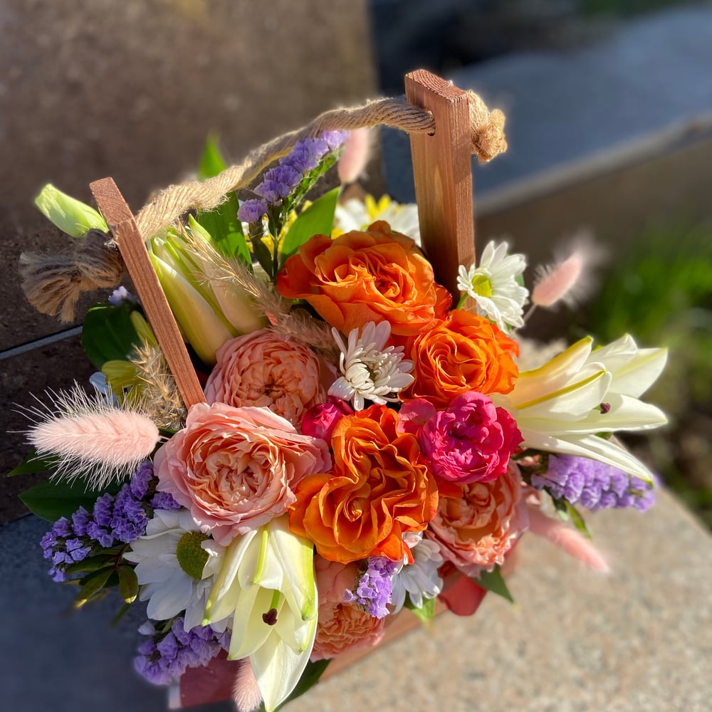 Коробка с цветами «Композиция в ящике "Яркий полдень"» из роз и хризантем