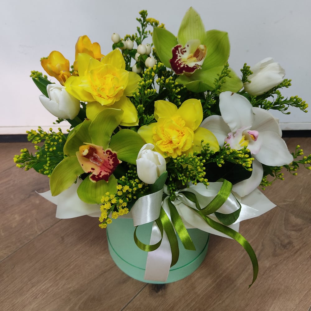 Шляпная коробка с цветами «Композиция "Весеннее утро"» из тюльпанов и экзотических цветов