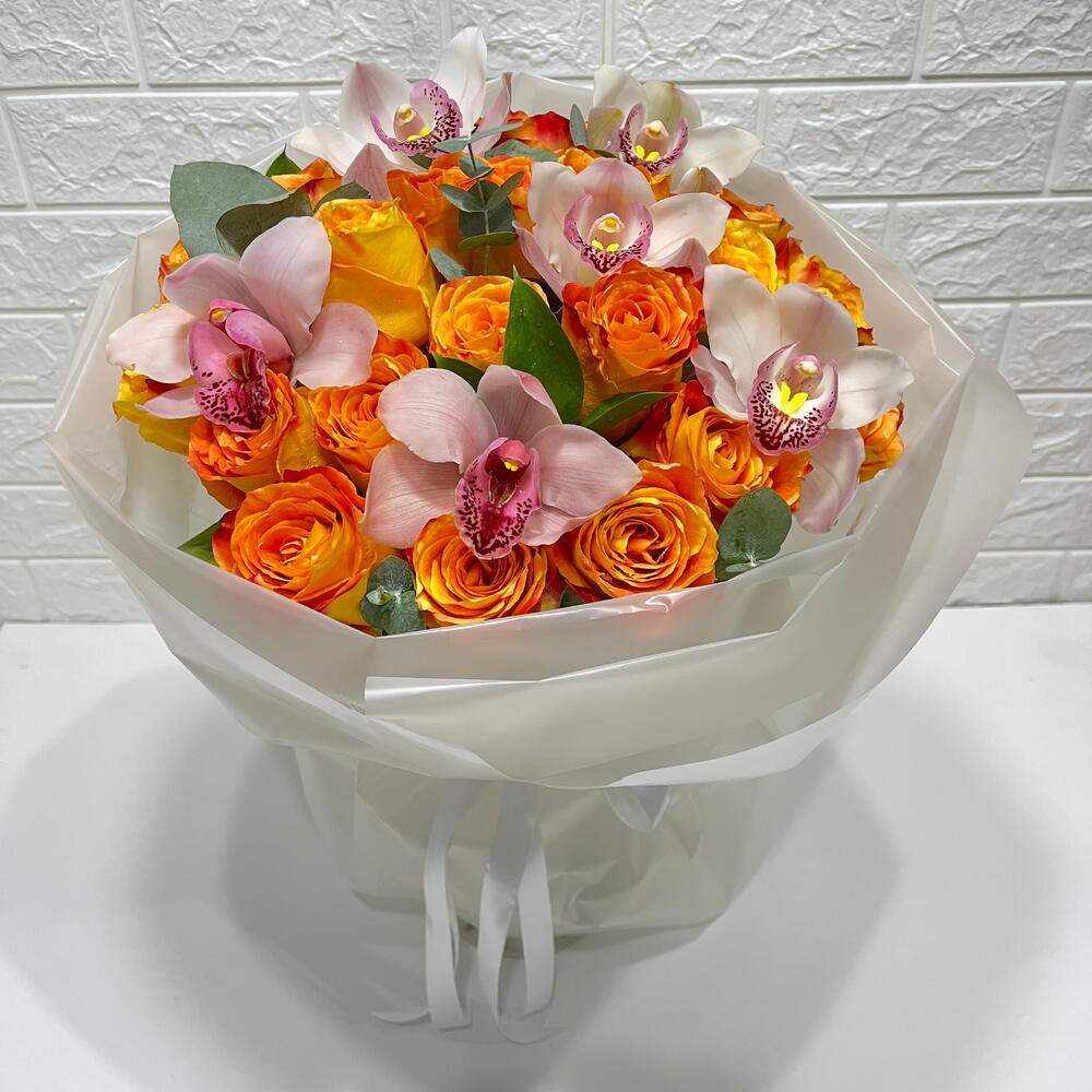 Орхидея цимбидиум - 6 шт. Рускус - 5 шт. Розы - 20 шт.