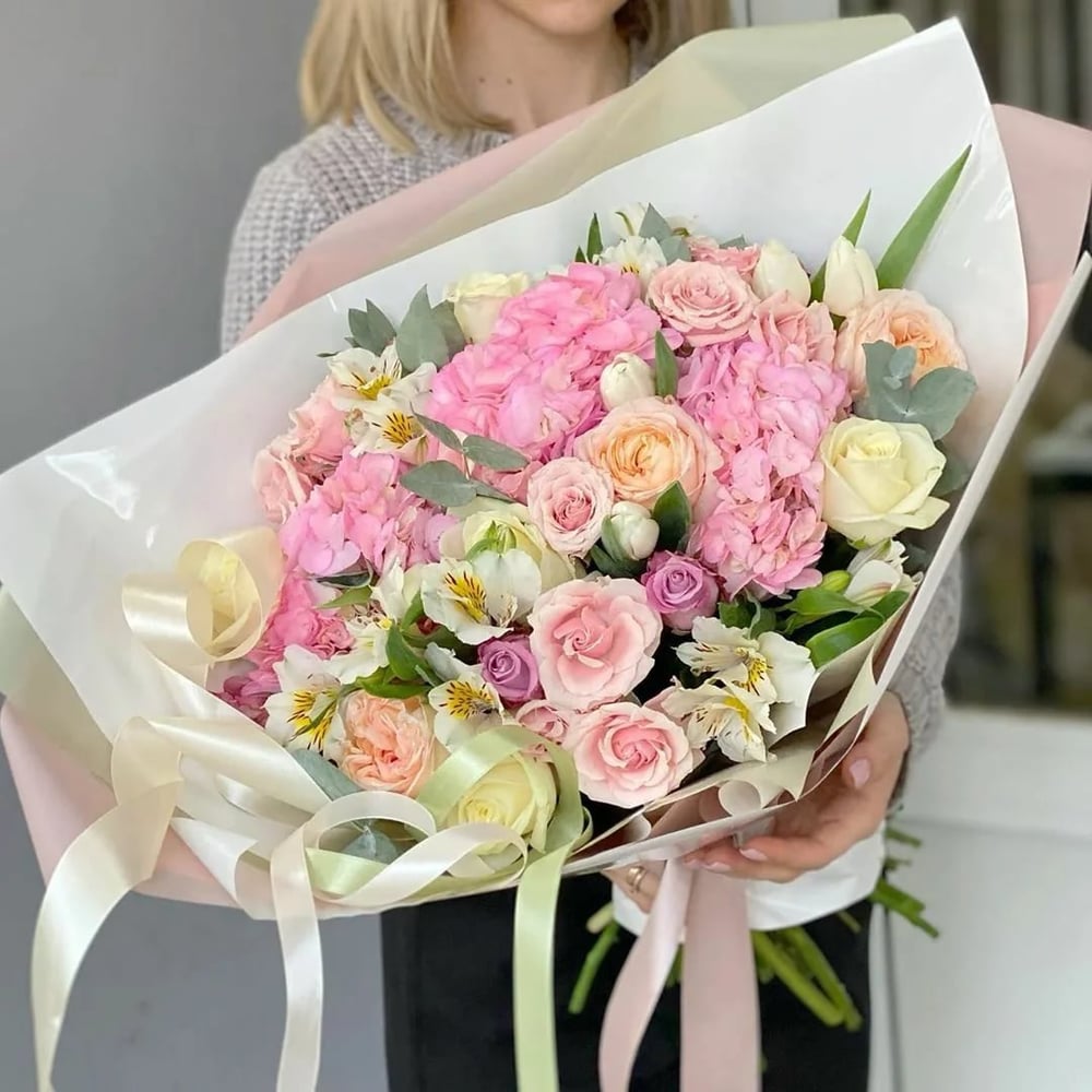🤩Желаете удивить близкого человека? Хочется, чтобы глаза сияли от счастья? Объёмный букет из ароматных свежих роз и гортензии - это именно то, что нужно! Ваш близкий человек будет в восторге!...