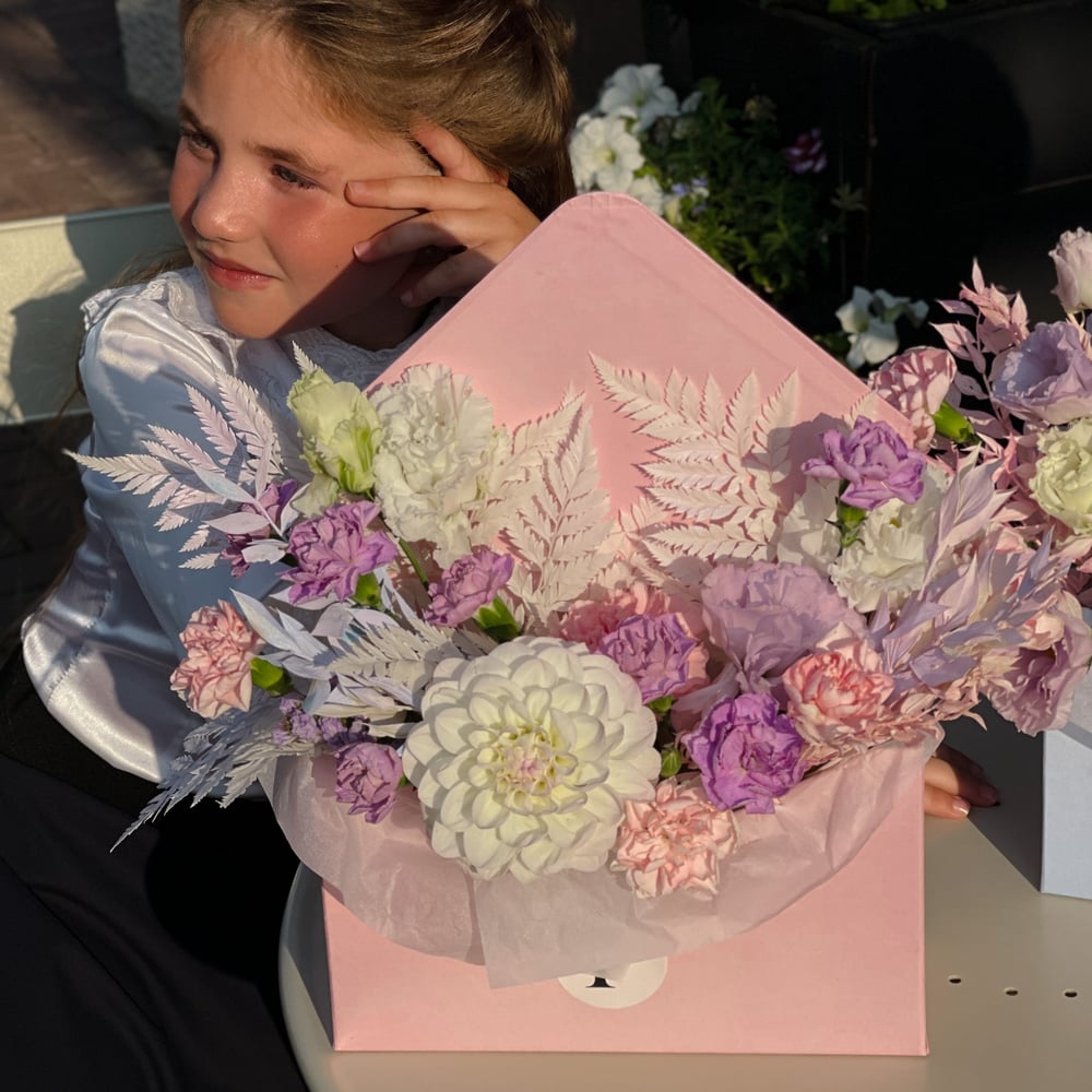 Коробка с цветами «Конверт "Нежный"» из гвоздик и эустом