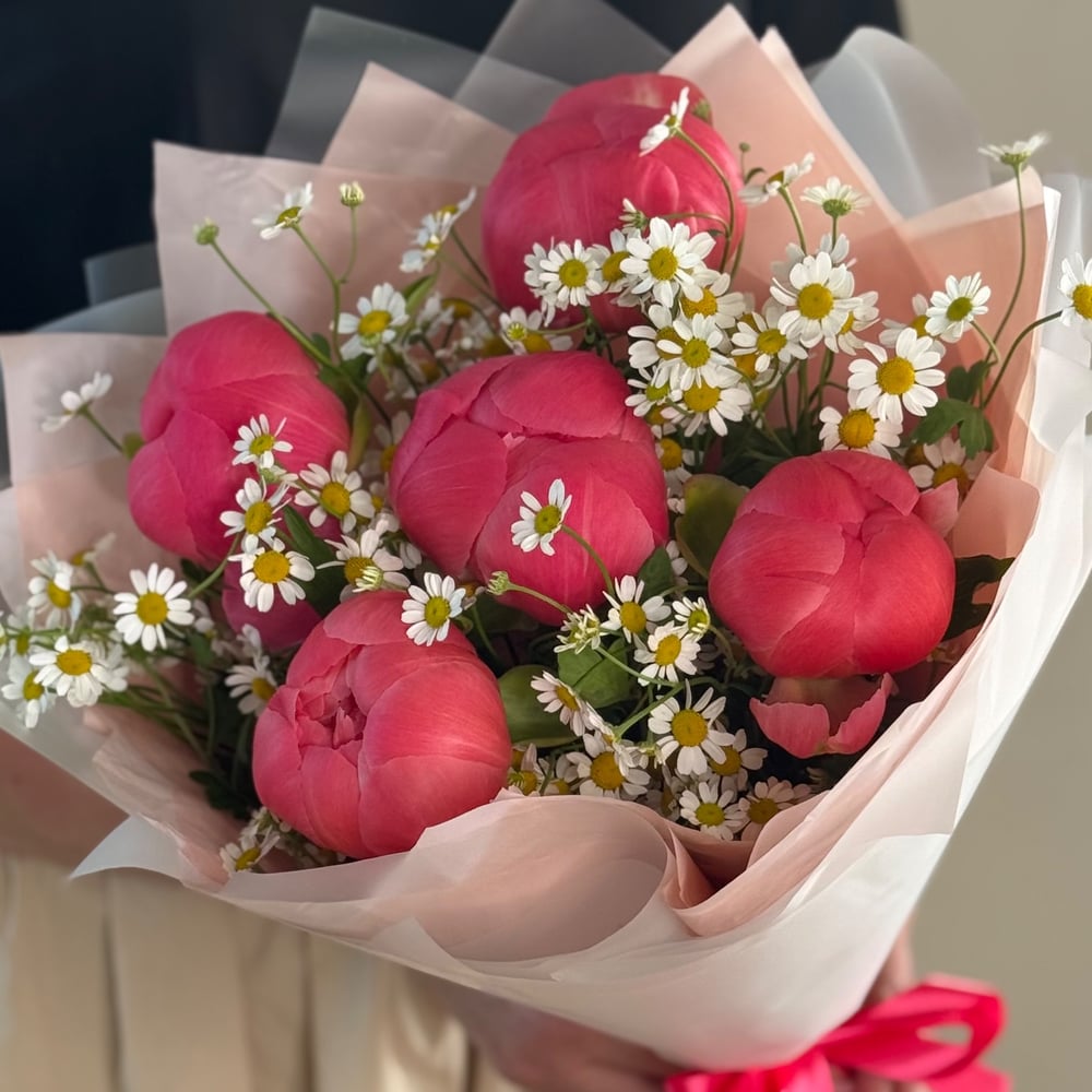 Букет «Коралл шарм с танацетумом» из пионов и ромашек