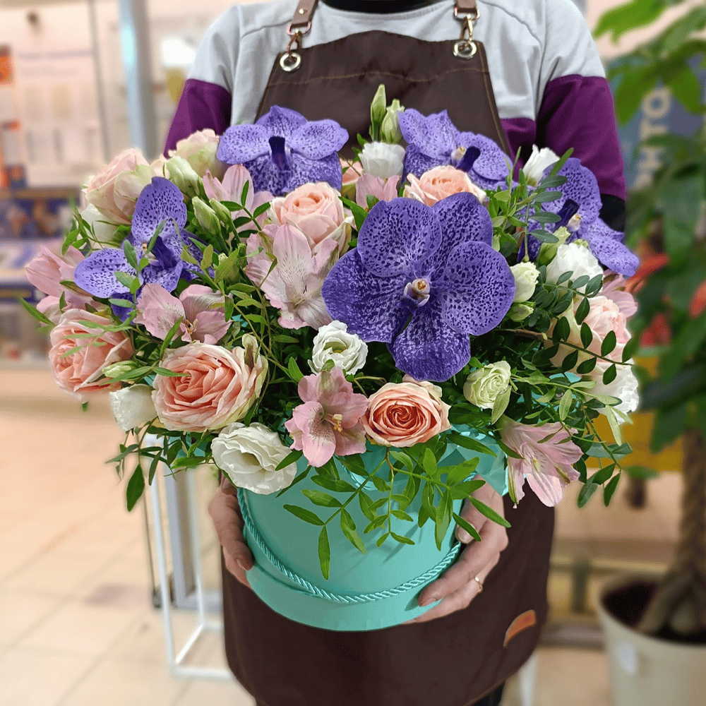 Шляпная коробка с цветами «Шик» из роз и эустом