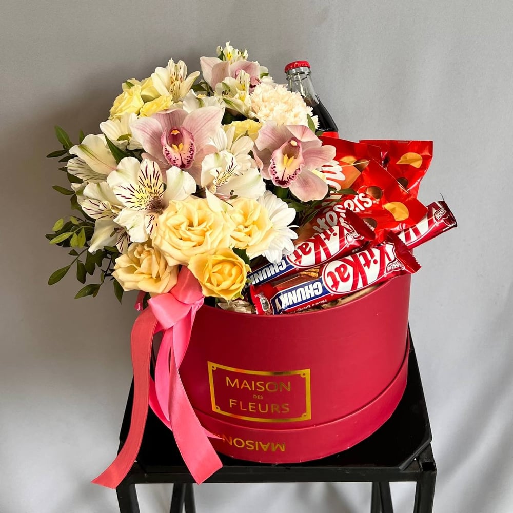 Подарочная коробка, наполненная яркими свежими цветами и сладкими радостями! Внутри вы найдете изысканный букет свежих цветов, который подарит тепло и улыбку, а также любимые сладости — хрустящие шоколадные батончики KitKat, нежные шарики Maltesers и освежающую бутылочку Coca-Cola. Идеальный подарок для особого человека, который сочетает в себе красоту природы и вкусные моменты счастья!