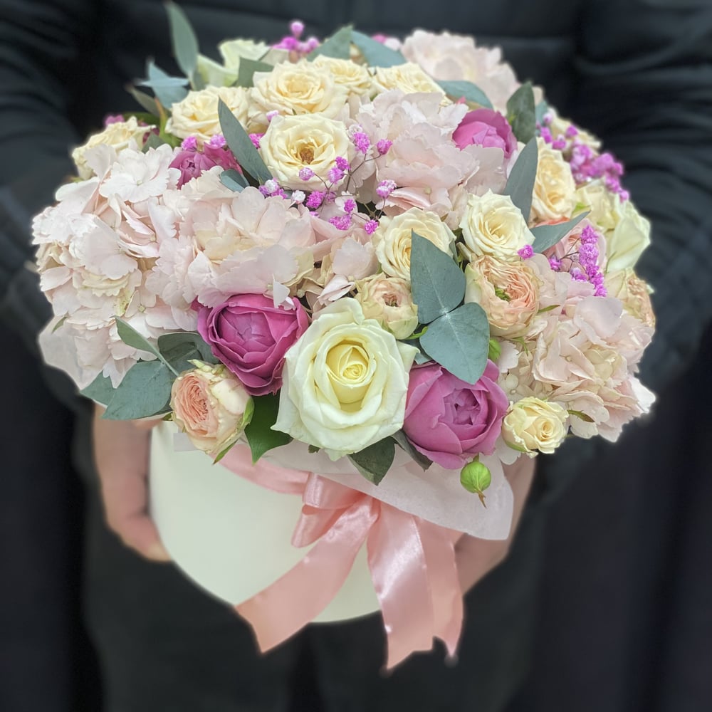 Шляпная коробка с цветами «Коробка нежности» из роз и гортензий
