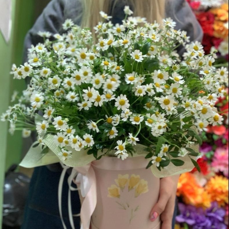 Состав: - матрикария 19 шт - зелень 4 шт - коробка - оазис флористический - лента