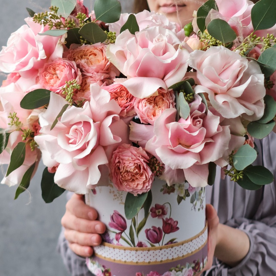 Шляпная коробка с цветами «Коробка с Французскими Розами 2»
