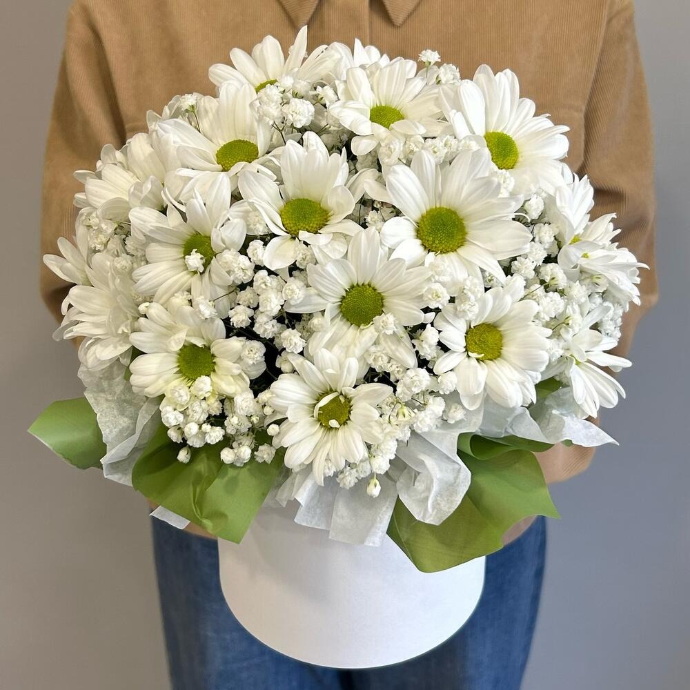 Милая композиция в коробке из стойких хризантем ромашка и воздушной гипсофилы. Плюсы дарить цветы в коробках: 🌿Удобна для транспортировки. 🌿 Не нужно искать вазу для цветов. 🌿 Не нужно обнов…