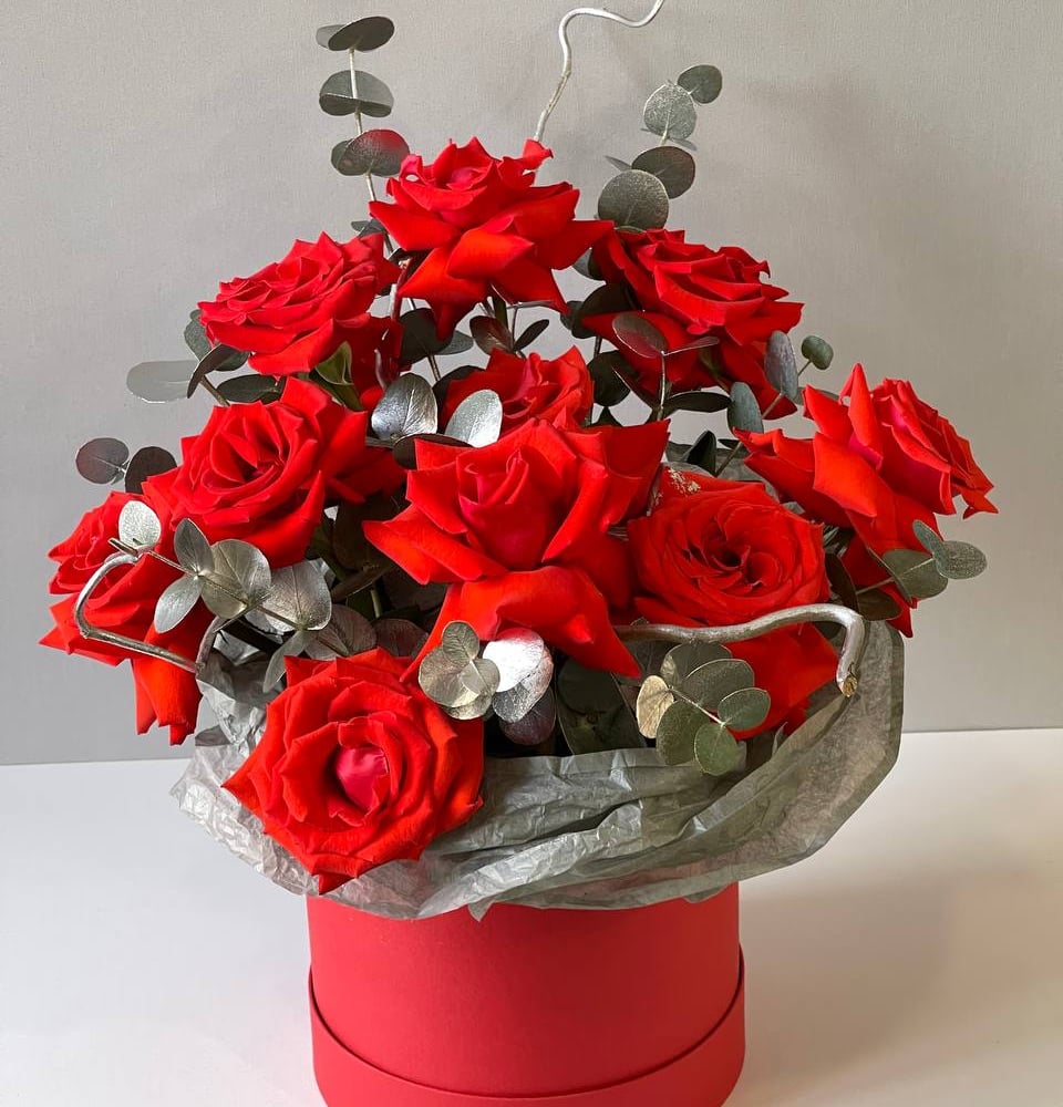 Шляпная коробка с цветами «Коробка с красной розой 11 шт»