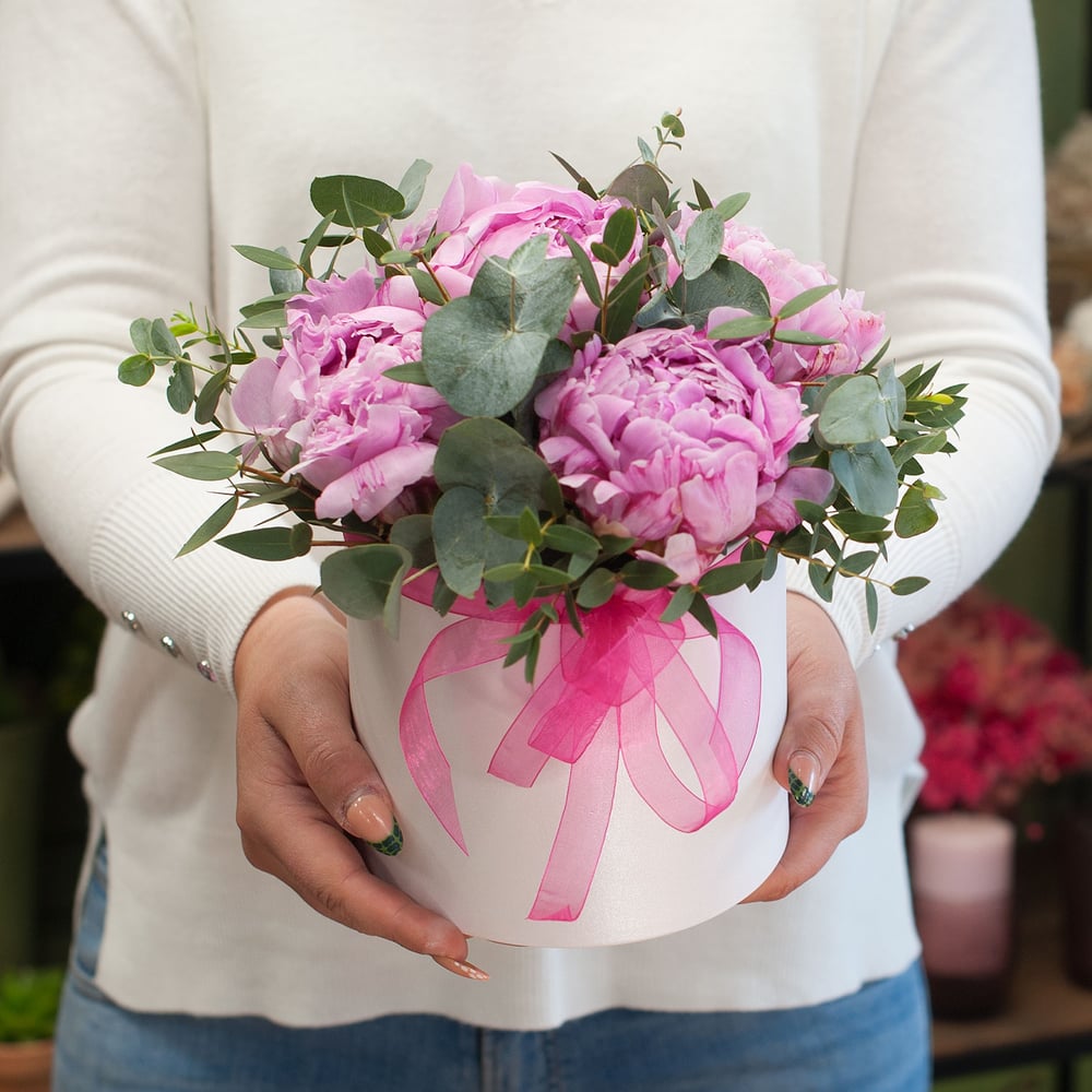 Шляпная коробка с цветами «Коробка с цветами "Пионовый рассвет"»