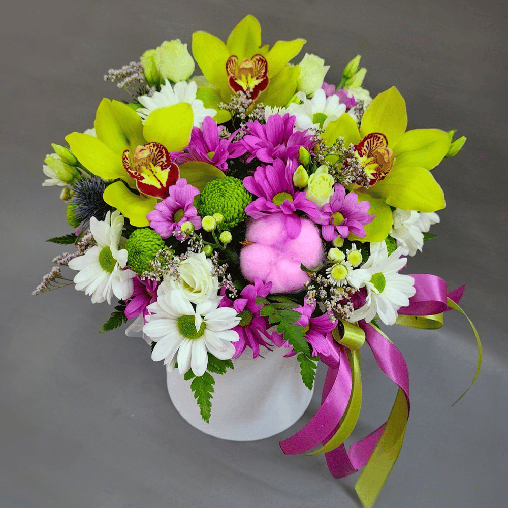 Шляпная коробка с цветами «Коробка сборная с орхидеями»