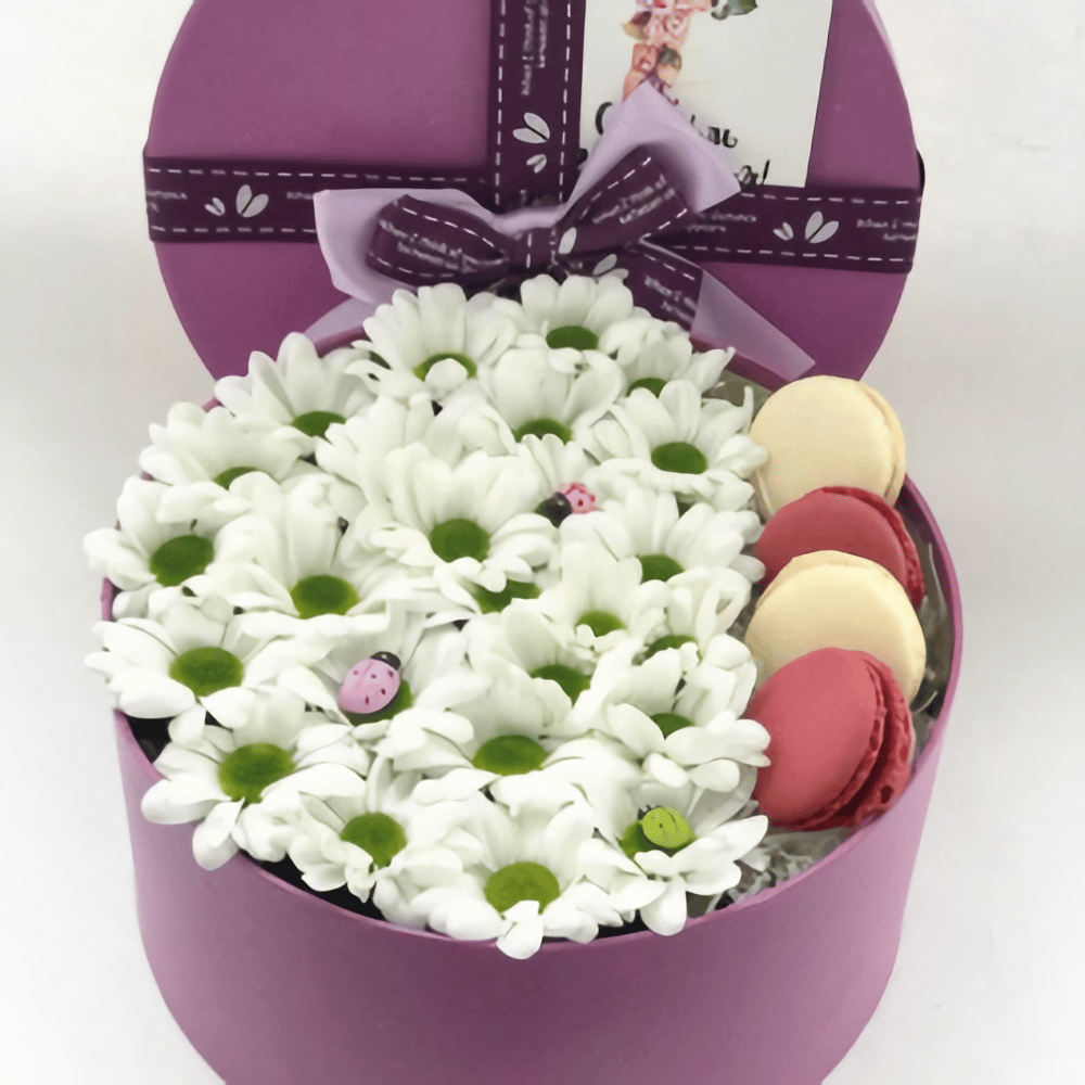 Коробка наполнена счастье и в подарок две сиреневые божьи коровки на удачу.