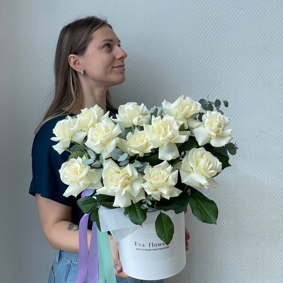 Коробочка с французским розами и эвкалиптами — отличный вариант для подарка.