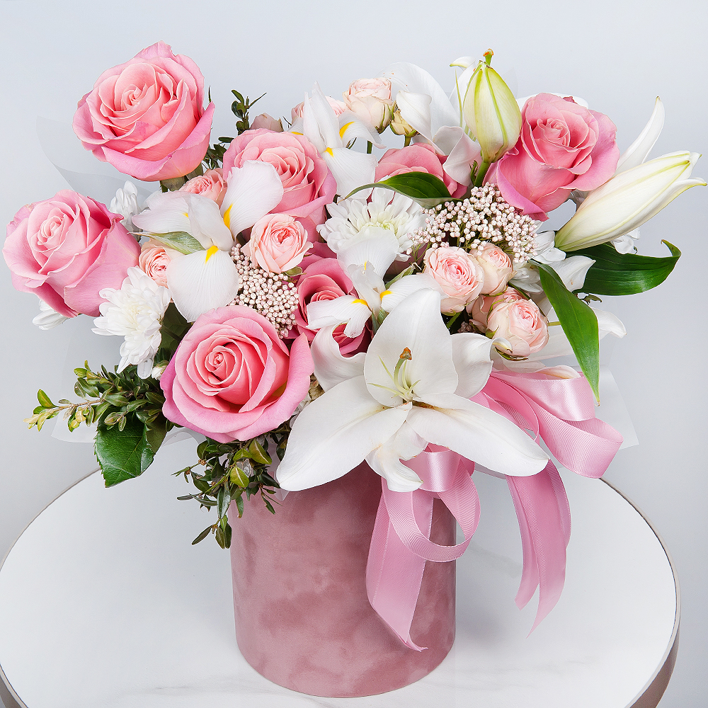 Шляпная коробка с цветами «Королевская элегия» из роз и ирисов