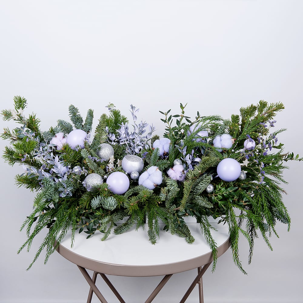 Эта композиция - истинное воплощение зимней роскоши. Нежные лавандовые акценты и серебристые шары в сочетании с пушистыми еловыми ветками добавляют благородство и изящество. Декоративное кашпо заверш…