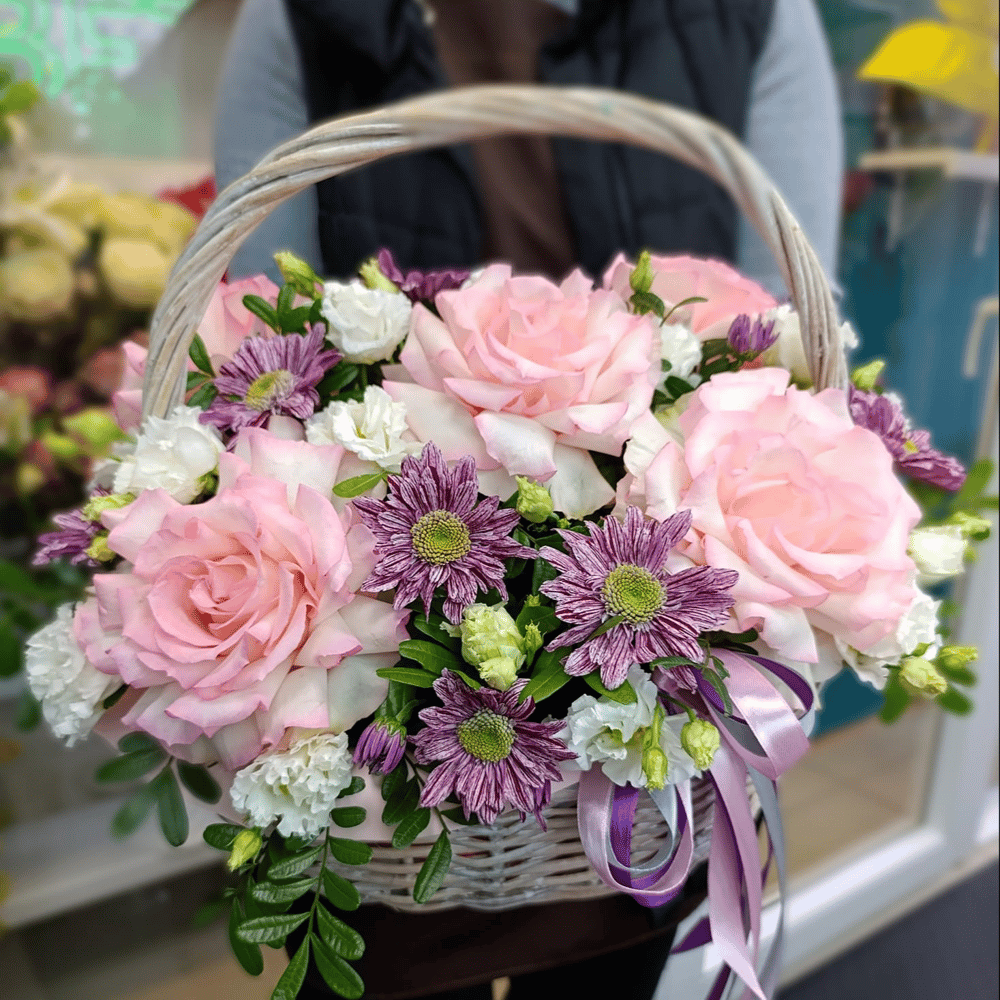 Корзина с цветами «Нежнятинка» из роз и эустом