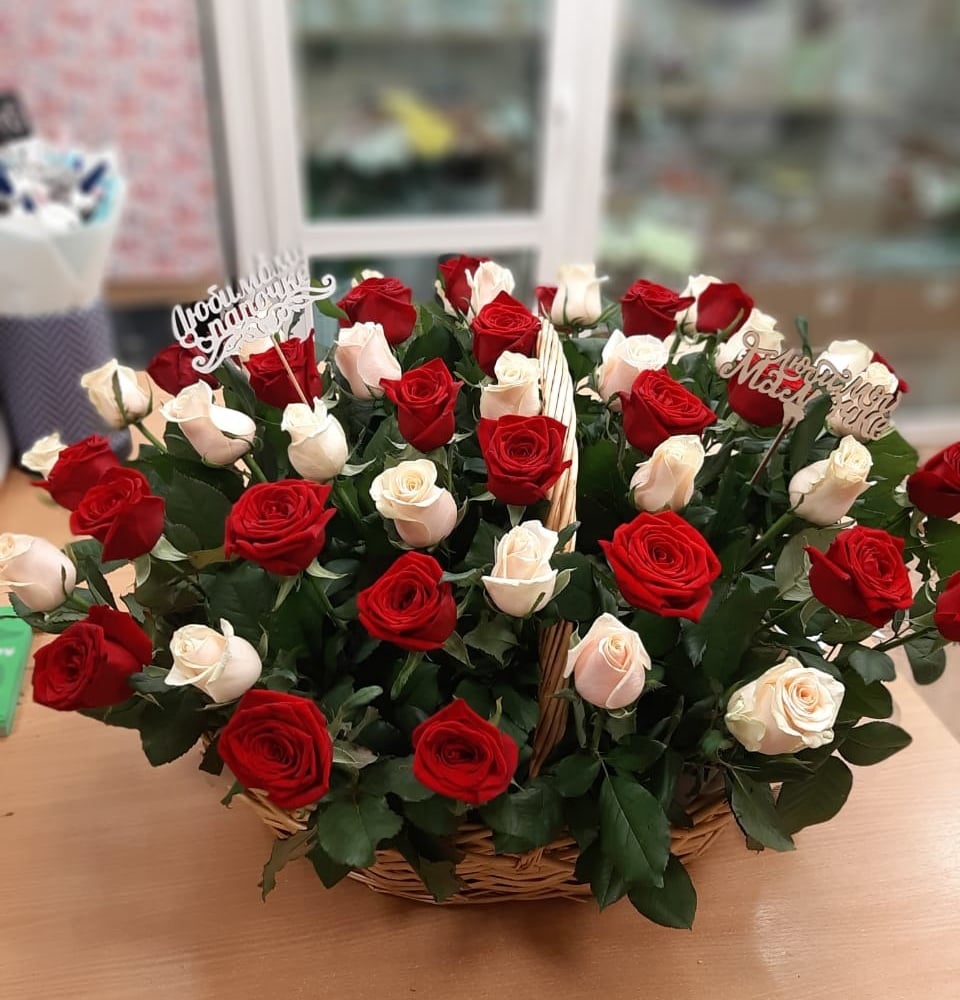 Корзина роз сорта Талея и Гран При, шикарный подарок к юбилею.