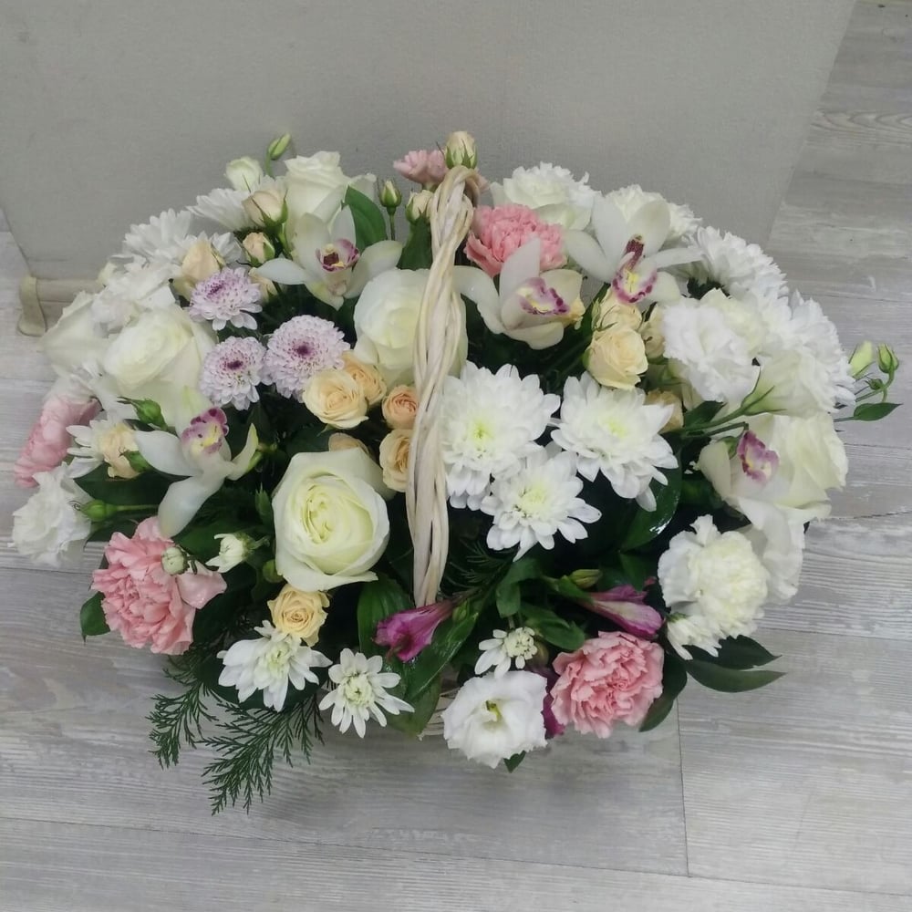 Корзина "Белое облако" из роз и гвоздик