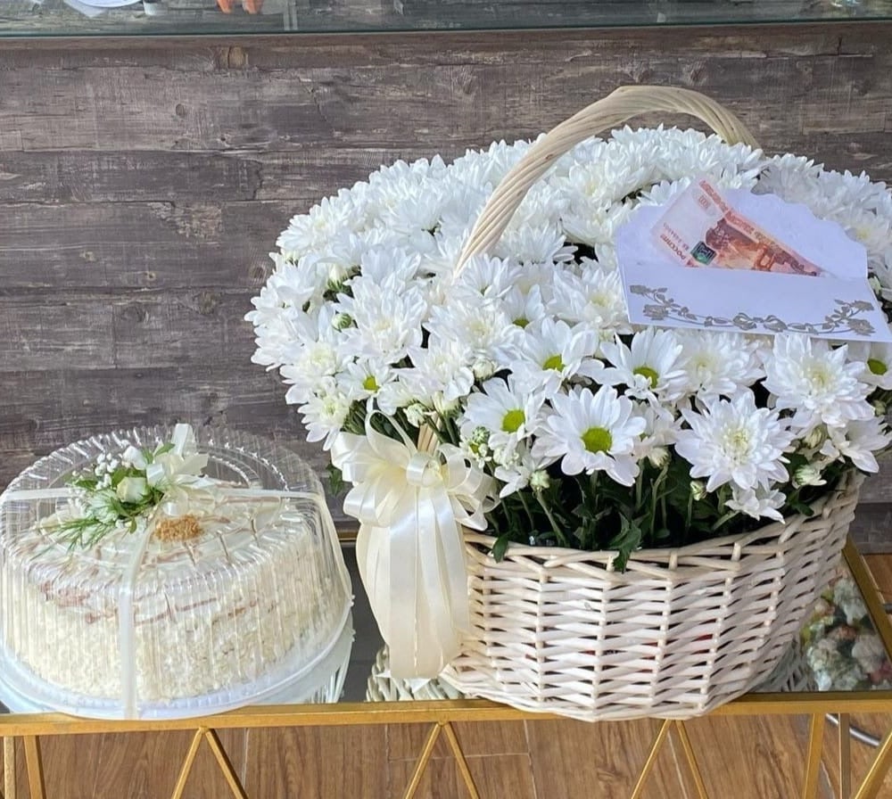 Подарочный набор «Корзина хризантем и вкусный торт»