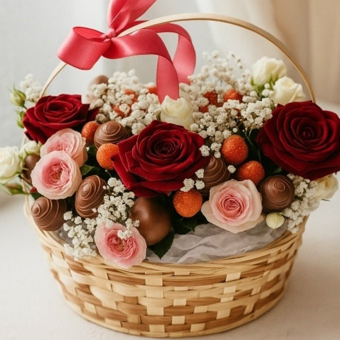 Цветочный каприз – это изысканное творение, где страстные алые розы переплетаются с нежными белыми и розовыми кустовыми розами, создавая завораживающий цветочный дуэт. В этой гармонии цвета и формы, словно драгоценные самоцветы, располагается аппетитная клубника в шоколаде, добавляя композиции сладкую нотку. Цветочный каприз – это воплощение утонченного вкуса и ярких эмоций, способное покорить сердце.