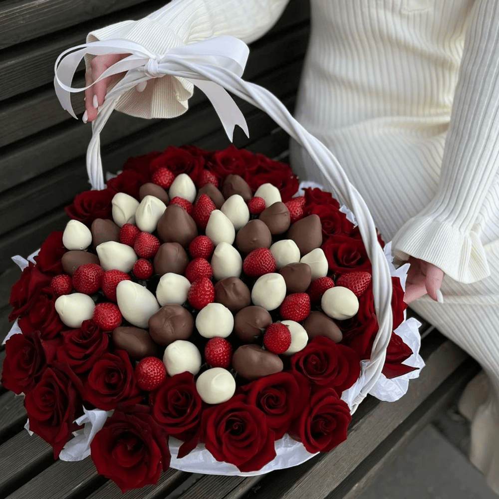 Корзина клубники в шоколаде и роз