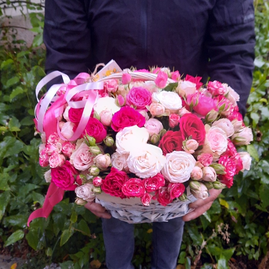 Корзина состоит из пионовидных кустовых роз микс