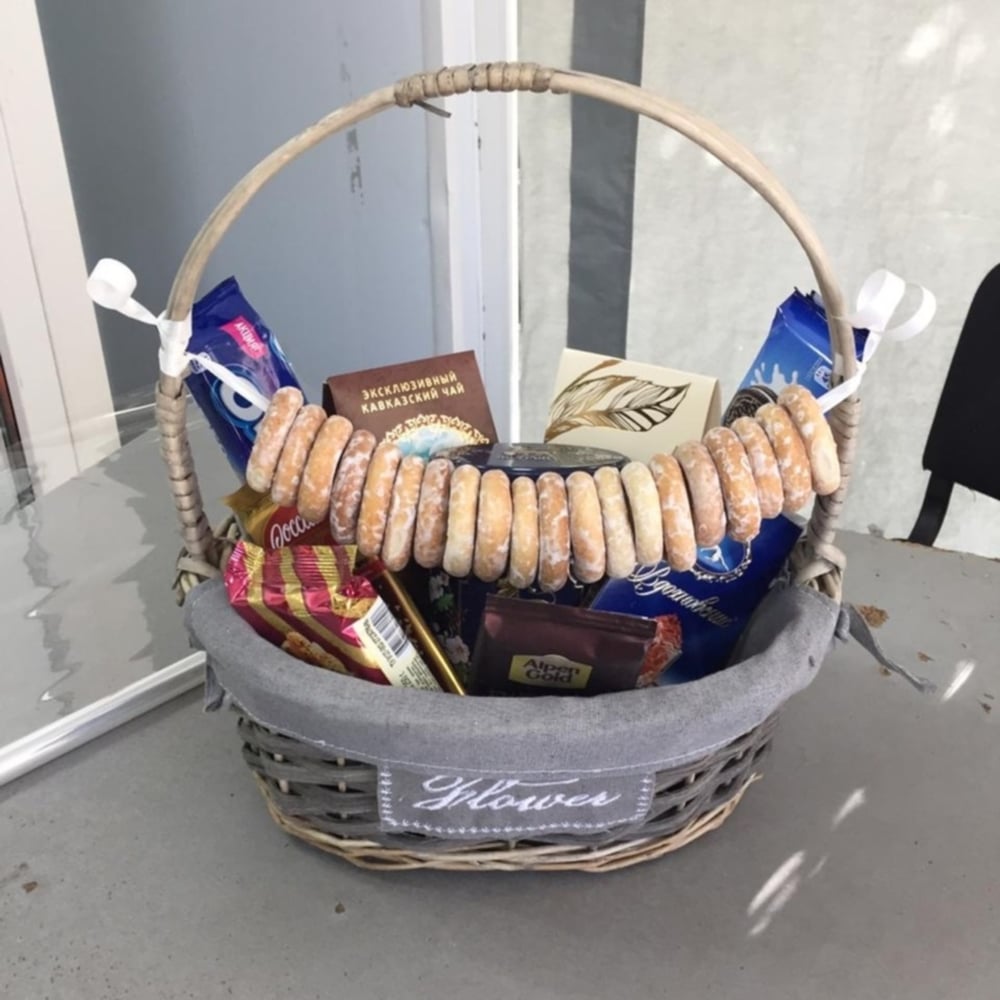 Корзина с чаем, конфетами и печеньем