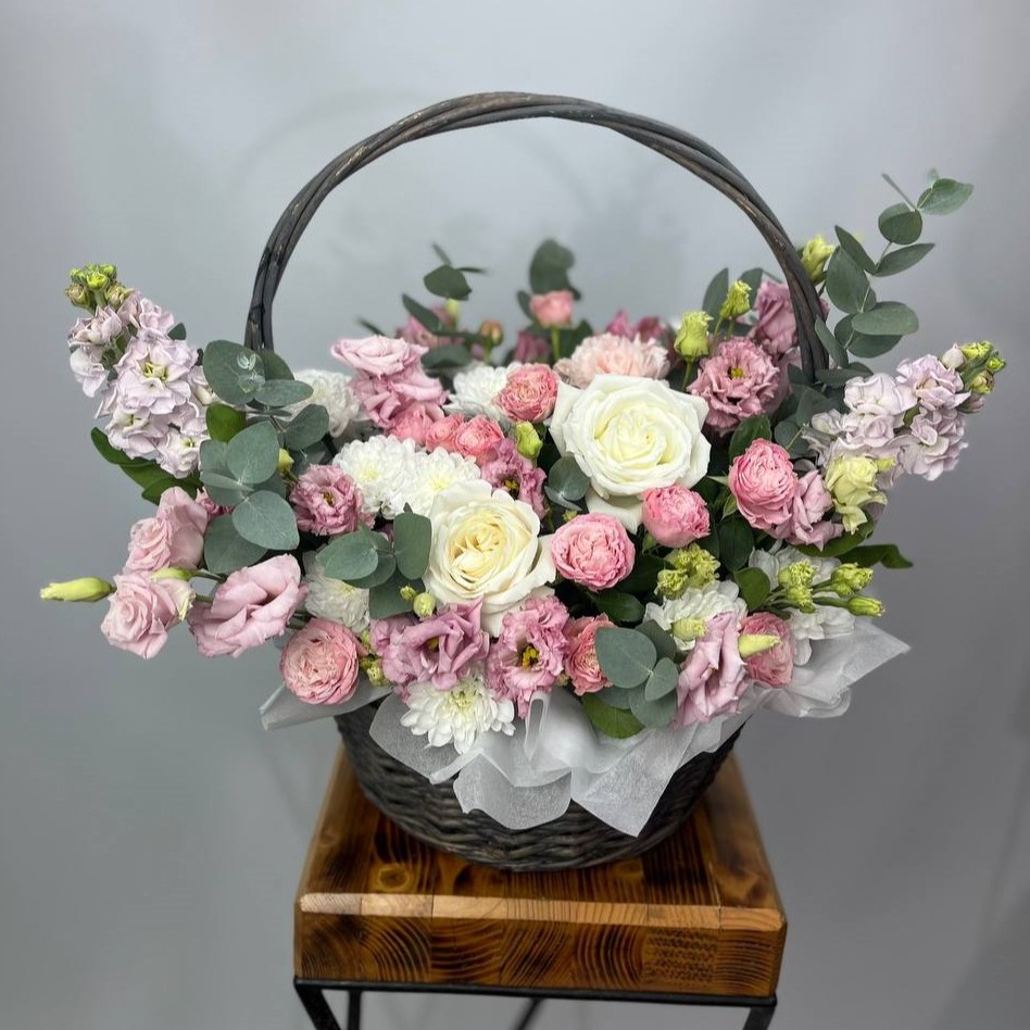 Корзина с эустомой и кустовыми розами