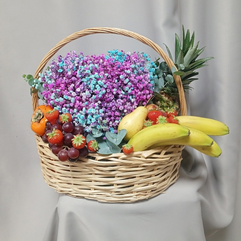 корзна большая с фруктами банан -5шт, груша-2шт, апельсины-2шт, хурма-2шт, ананас-1шт, клубника-10шт, виноград гроздб-1ветка, гипосфила -13шт,оазис-2шт. прозрачная упаковка для транспортировки -2шт.