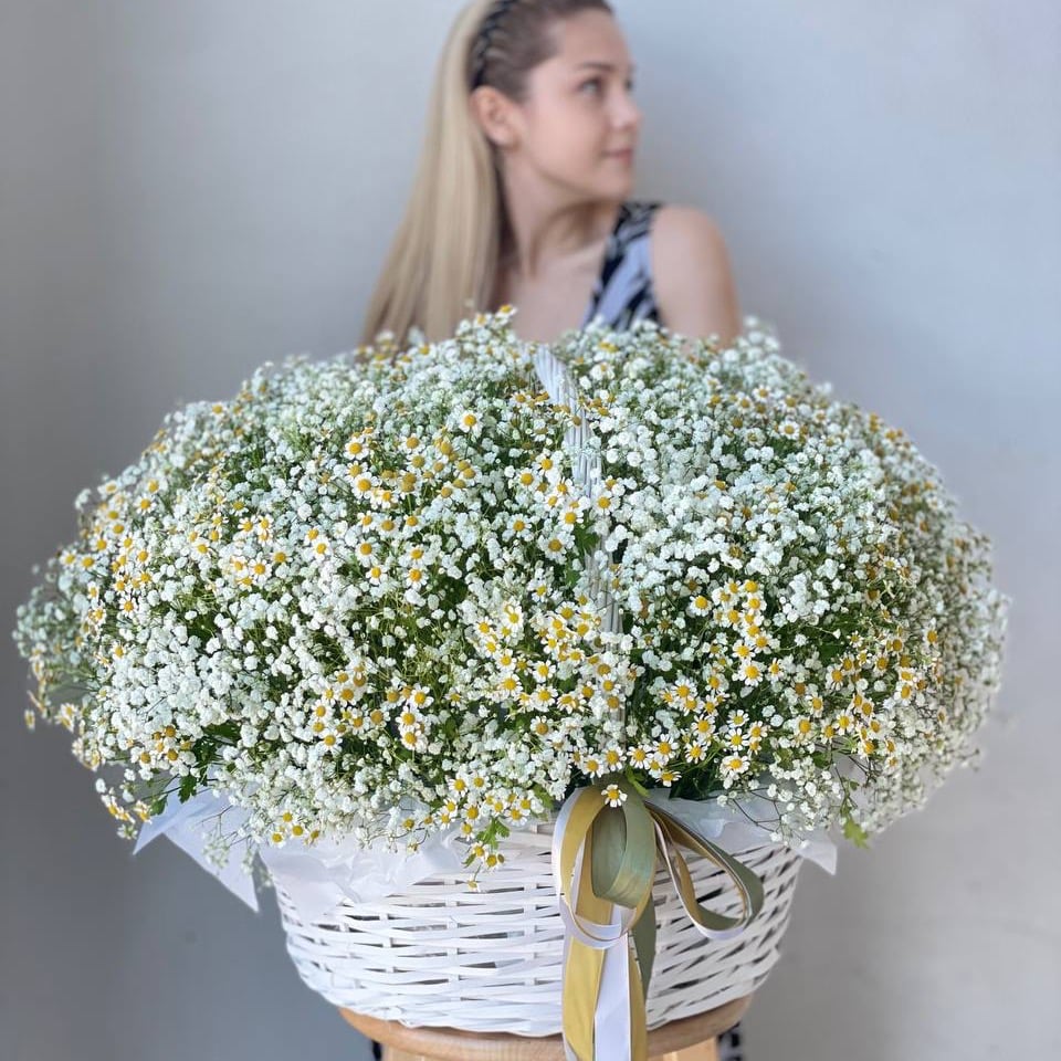 Стильная корзина с гипсофилой и ромашками идеальный подарок для любого случая. Она наполнена цветами, гармонично сочетающимися по цвету и создающими атмосферу уюта и теплоты🙌