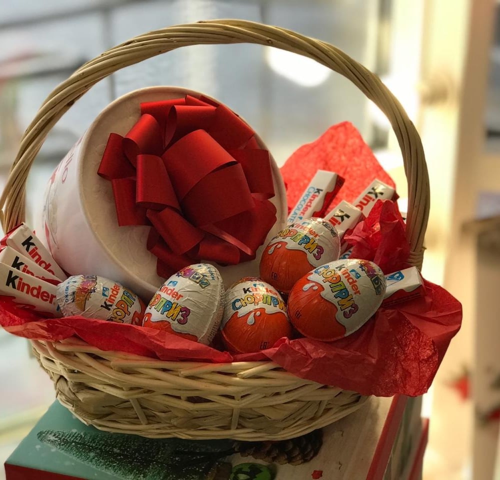 Корзина с конфетами Raffaello и яйцами и шоколадкой Kinder