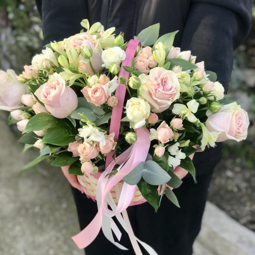 Корзина из нежно-розовых голландских роз, ароматной фрезии, кустовых роз и альстромерии. Красивая зелень благородного эвкалипта. Атласный бант. Корзина с цветами с доставкой цветов в Адлере удобна по любому поводу.