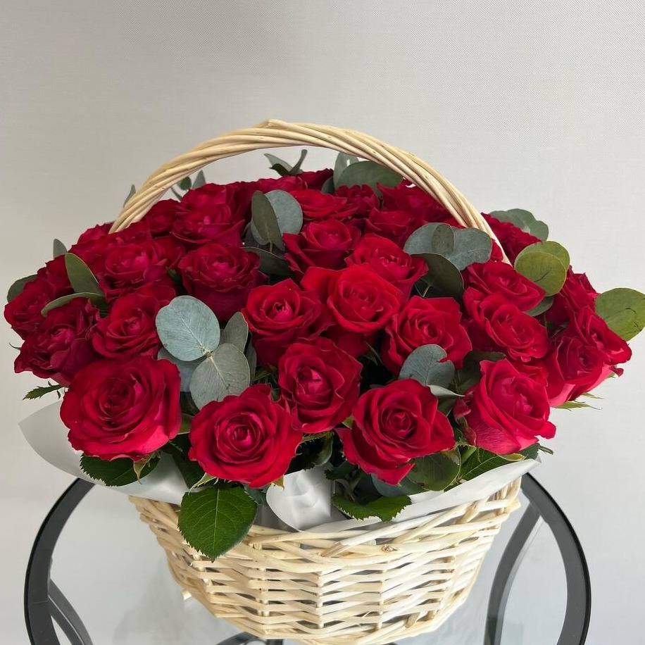 Букет из нежных роз и ароматного эвкалипта, упакованный в оазис и представленный в стильной корзине - это прекрасный подарок, который сможет порадовать любого получателя. Розы символизируют любовь и нежность, а эвкалипт придает букету свежесть и утонченный аромат. Этот букет станет отличным дополнением к любому торжественному событию или просто прекрасным способом выразить свои чувства и уважение к любимому человеку.
