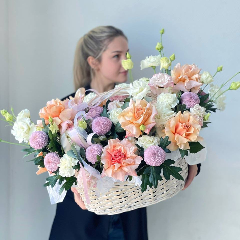 Милая корзина в нежных оттенках – это идеальный подарок для любого случая. Она наполнена цветами, гармонично сочетающимися по цвету и создающими атмосферу уюта и теплоты.