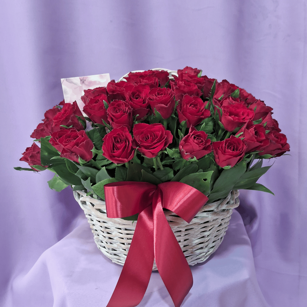 51 кенийская красная роза в корзине с атласным бантом
