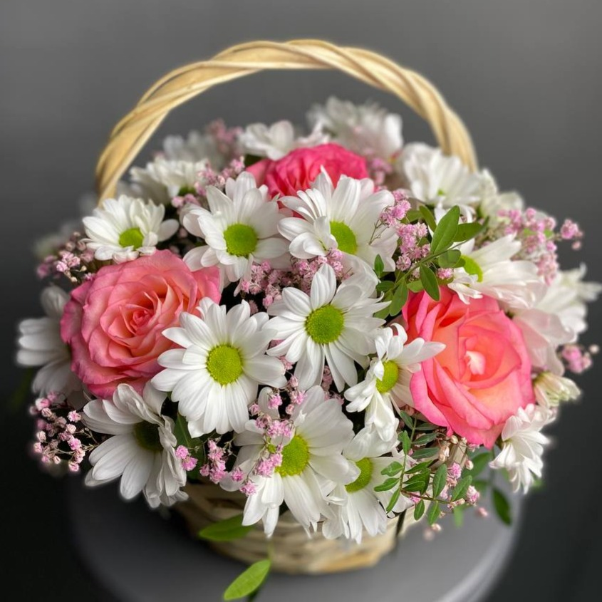 Композиция в корзине с розами, хризантемами и гипсофилами