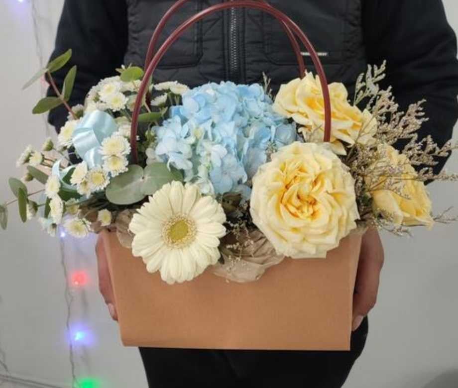 сумочка с голубой гортензией, пионовидной розой и хризантемой