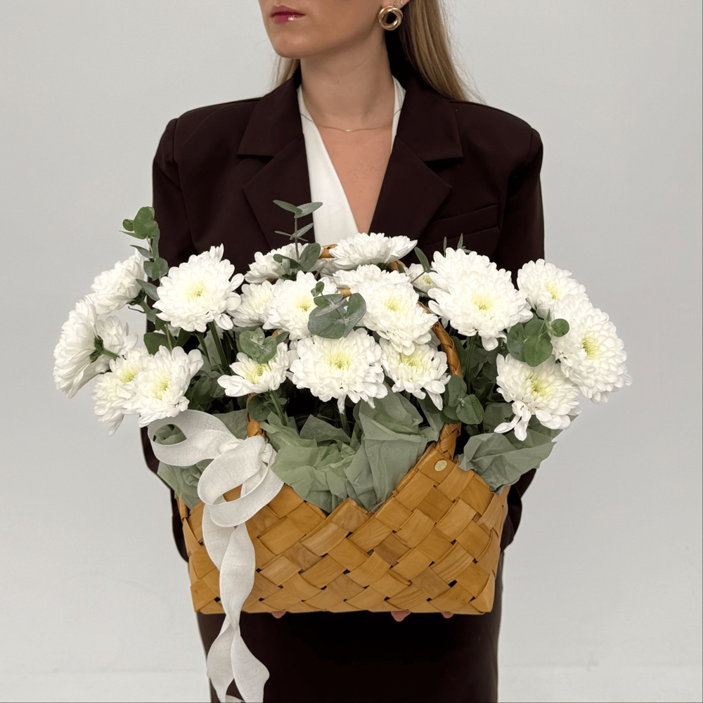 Корзинка с хризантемой и эвкалиптом