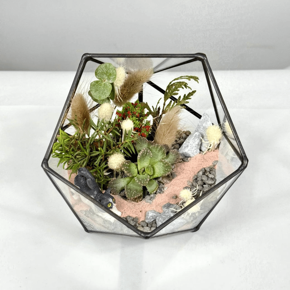 В этом флорариуме оживает сцена из самого доброго мультфильма. Любопытный черно-белый кот пробирается по тропинке из розового песка сквозь заросли экзотических суккулентов и пушистых трав. Мягкие кол…