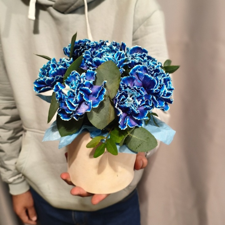 диантусы космические в бархатной шляпной коробке с эвкалиптом