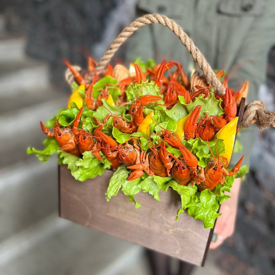 Букет из раков с зеленью в деревянном ящике "Крафтовый пикник"