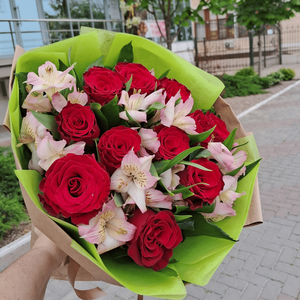 Роза красная 11 штук Альстромерия 4 штука Упаковка