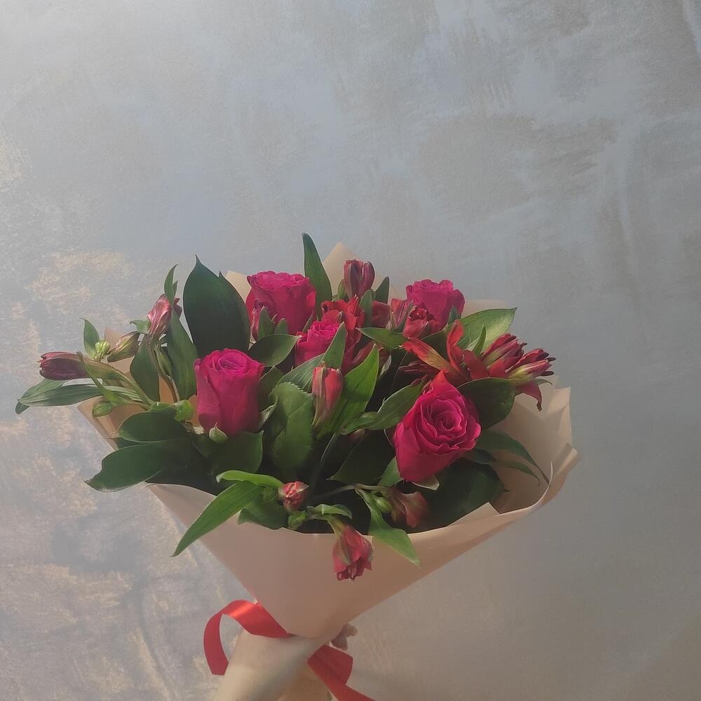 Этот изысканный букет состоит из элегантных роз, нежных альстромерий Он упакован в стильную дизайнерскую упаковку, которая подчеркивает его изысканный вид и делает его идеальным подарком для любого случая. Уход за срезанными цветами. Налейте в чистую большую вазу много прохладной воды. Подрежьте цветы секатором или острым ножом под углом 45°C и поставьте цветы в воду. Цветы не любят жару, сквозняк или холод, а также прямого солнца. Не ставьте букет или композицию у батареи, под кондиционером или на подоконнике, возле фруктов. Раз в день нужно менять воду . Чтобы цветы дольше простояли, ежедневно подрезайте стебли цветов. Все букеты сделаны нашими флористами. Цветы - это живой организм, они всегда разные. Поэтому даже букеты со 100% одинаковым составом будут различаться.