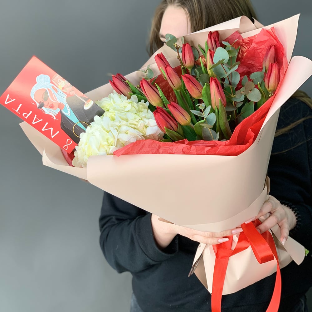 Букет «Красные тюльпаны с гортензией»