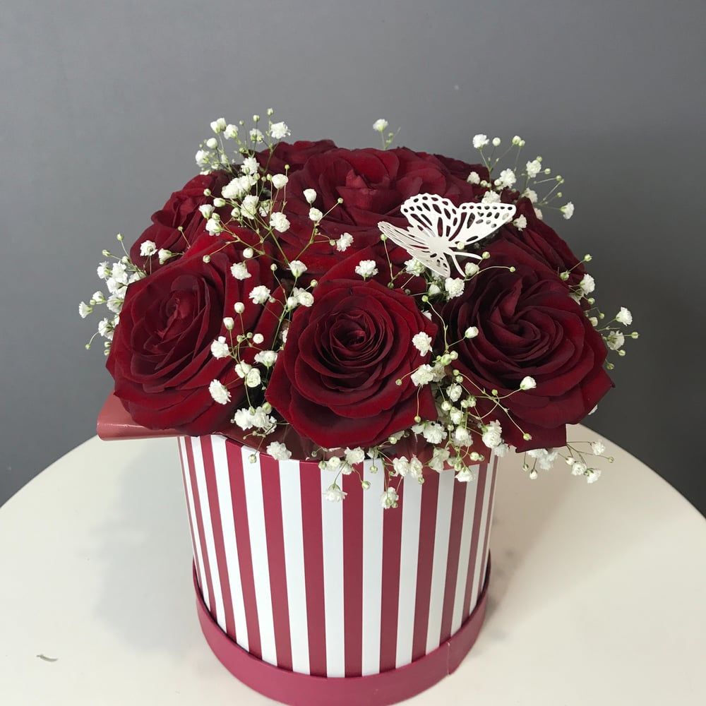 Шляпная коробка с цветами «Красный и белая» из гипсофил