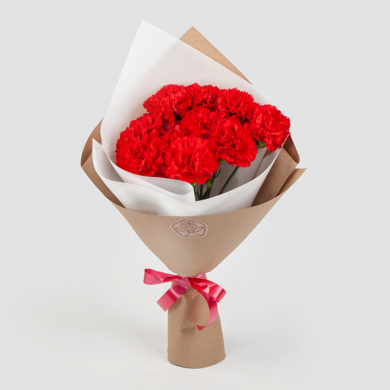Букет из 11 красных гвоздик - яркий и торжественный подарок, который призван передать адресату самые лучшие пожелания! Оформление в двухслойную крафтовую упаковку делает вид такого букета более современным и интересным.
